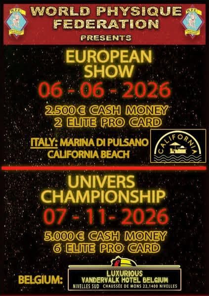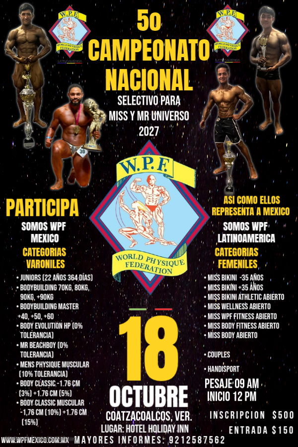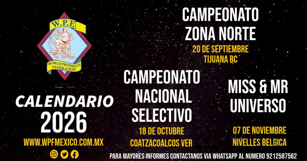 Participa en el campeonato nacional WPF México y busca tu pase al Mr. Universo 2026, todos los atletas de todas las federaciones, asociaciones y ligas son bienvenidos. #somoswpfmexico #somoswpfinternacional #somoswpfsudamerica #somoslafamiliawpf